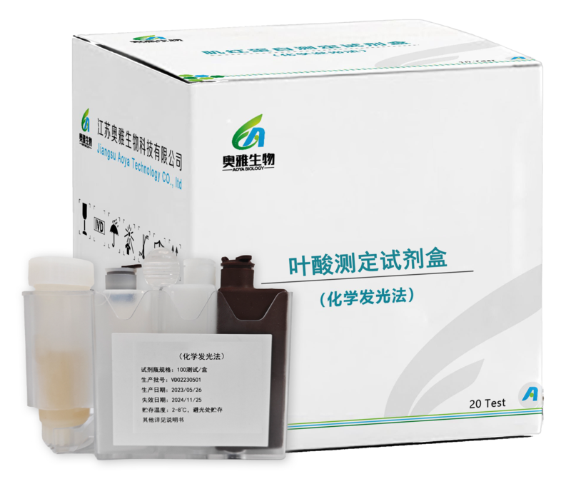 本产品为化学发光技术的免疫竞争测定法。试剂盒含有吖啶酯标记的叶酸抗原以及偶联了抗叶酸鼠抗人IgG抗体的磁珠。样本中的叶酸和吖啶酯标记的叶酸抗原与磁珠结合的抗叶酸鼠抗人IgG抗体通过免疫反应,竞争结合形成复合物。触发剂触发化学反应后发出的光信号与样本中叶酸的含量相关,通过化学发光分析仪测量把光信号转换为叶酸的浓度。